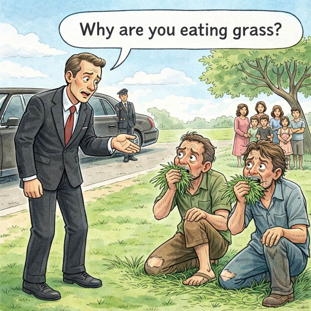 One afternoon a lawyer was riding in his limousine when he saw two men along the roadside eating grass. Disturbed, he ordered his driver to