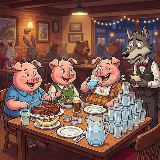 Three Little Pigs went out to dinner one night… The waiter came to take their drink orders. “I’ll have a Sprite,” said the first little