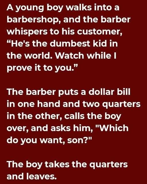 young boy walks into a barbershop, and the barber whispers to his customer, “He’s the dumbest kid in the world. Watch while I prove it