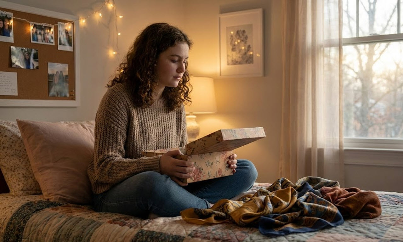 After she passed, her scarves stayed in a floral box with pink hydrangeas on the lid. It sat high on my closet shelf, just out of everyday reach. I didn’t open it often. But when I missed her more than usual, I’d take it down, lift the lid, and let the scent of jasmine and vanilla fill my chest until it ached.