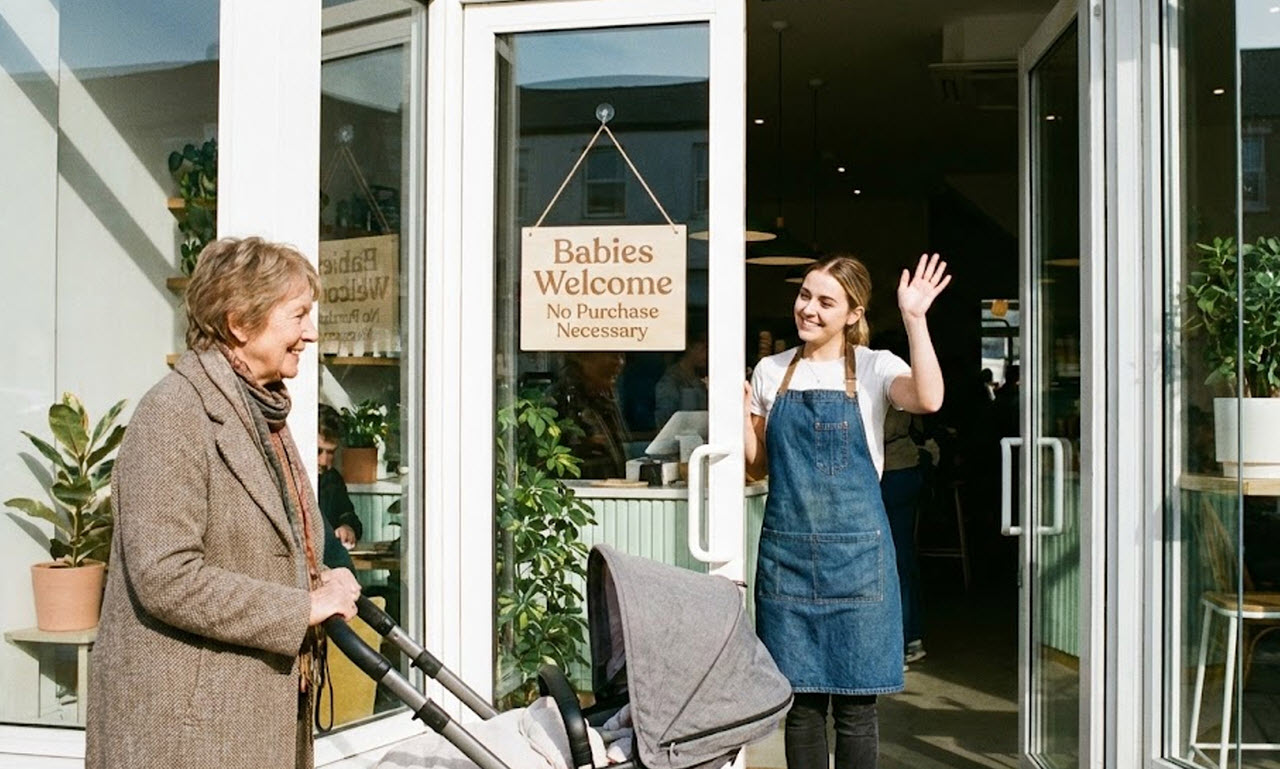 Curious, I went there a week later with my stroller. The sign at the door said, “Babies Welcome. No Purchase Necessary.”