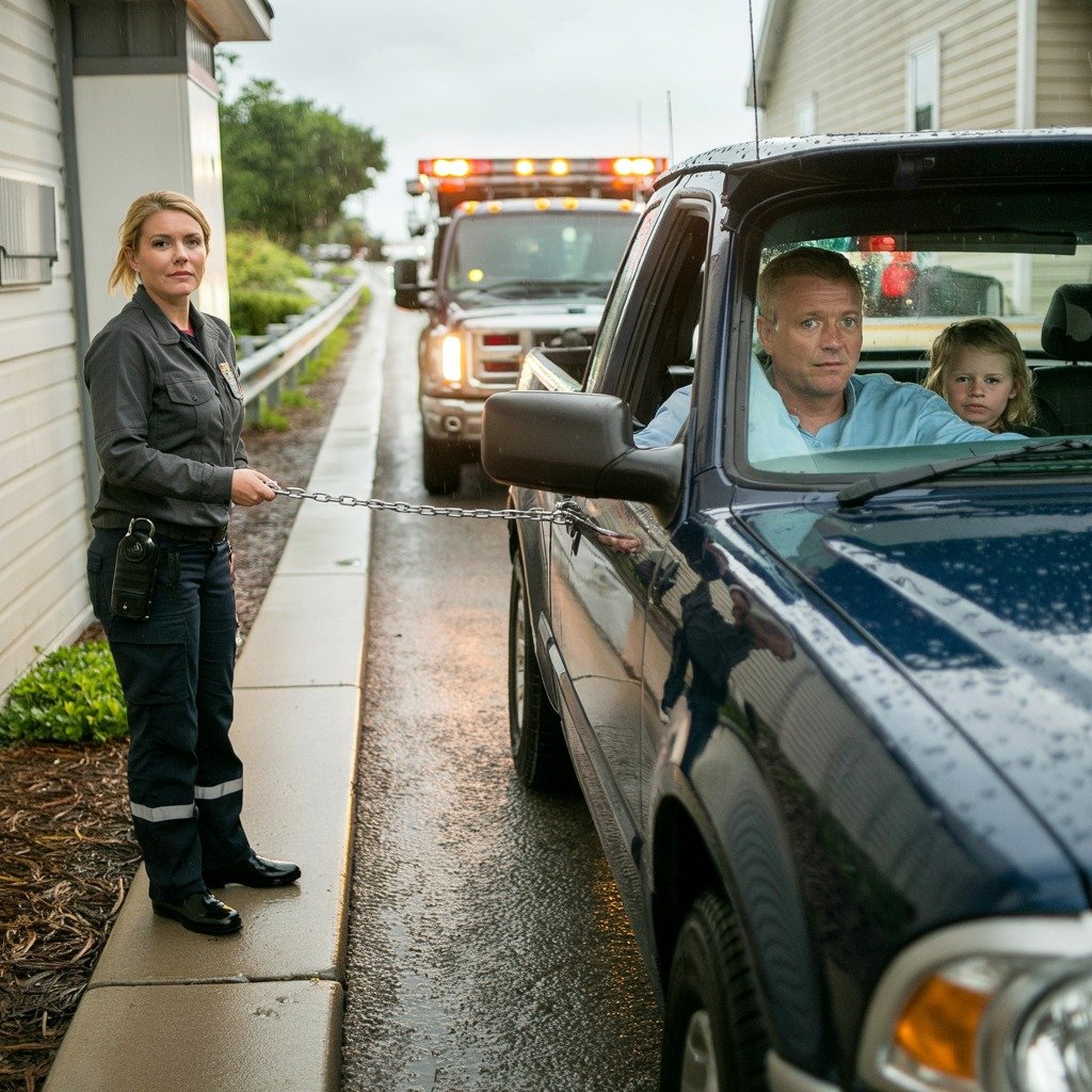 The storm howled while I hooked the SUV to my truck, my uniform clinging to my skin, water filling my boots. When everything was secure, I climbed back into the cab and checked the mirror. Their headlights glowed faintly behind me through the deluge.