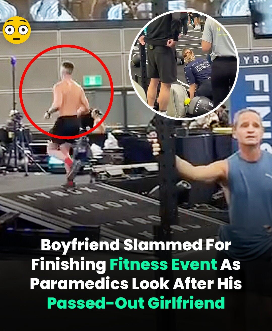 A young man is getting roasted online after finishing a HYROX race while his girlfriend was passed out and getting help from paramedics. The clip