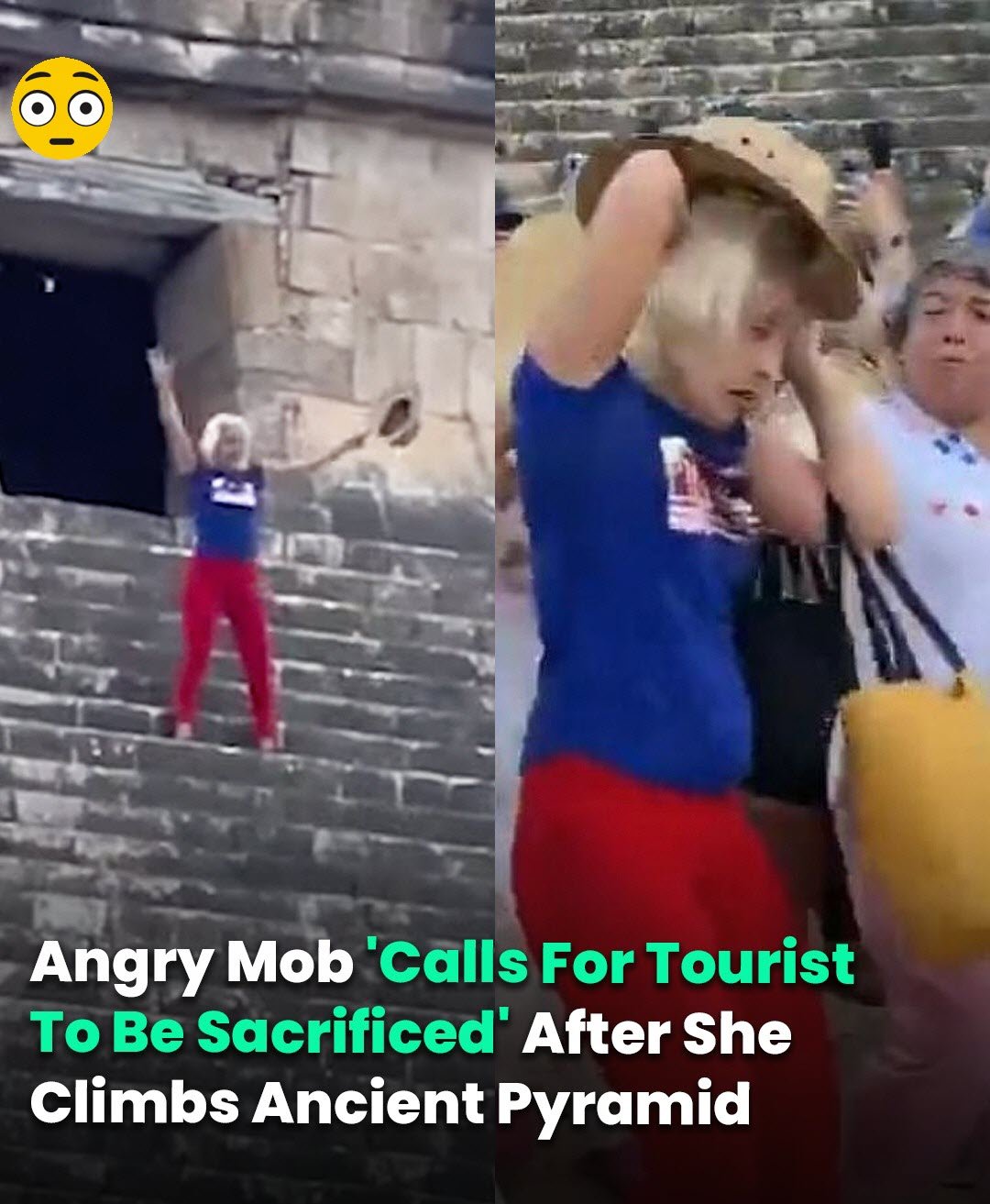 An angry crowd turned hostile after a tourist climbed an ancient pyramid, with some people yelling that she should be sacrificed when she came back