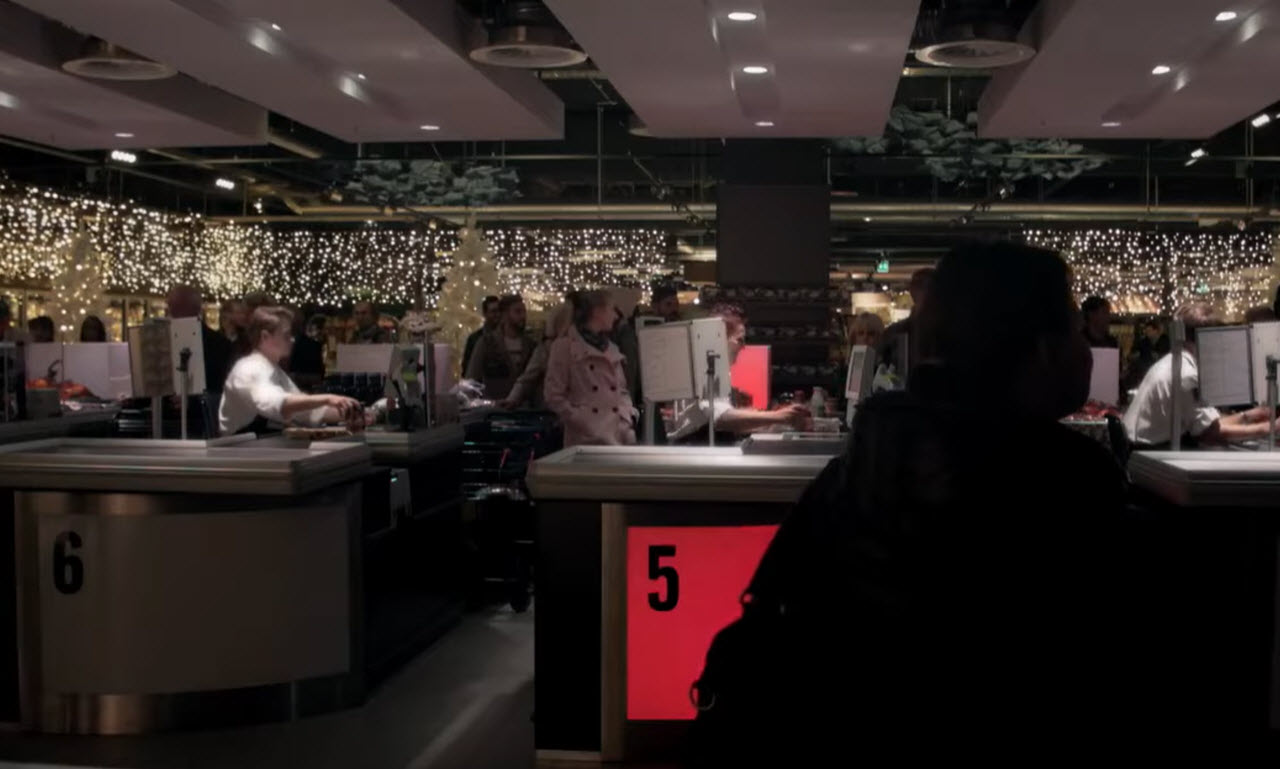 That uncertainty ended when the store lights suddenly dimmed. The space was lit mainly by the red and green glow of the checkout registers, instantly changing the atmosphere and making the moment feel planned, festive, and a little magical.