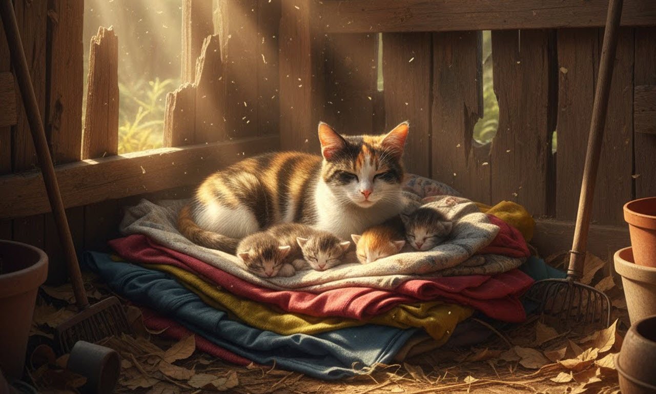 There, neatly arranged in a pile, were Lily’s things! Her purple scarf, her blue hoodie, the soft white cardigan she hadn’t worn since second grade – and nestled into them, as if swaddled by her memory, was a thin calico cat. Her belly rose and fell in a slow, rhythmic purr. Curled up against her were three tiny kittens, no bigger than teacups.