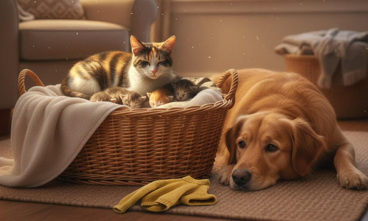 We kept them all. The mother cat was calm and affectionate, and her kittens grew stronger every day. Baxter watched over them as if it were his full-time job.
