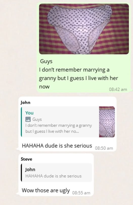I peeked into his group chat and saw he sent this photo to his buddies, saying he “doesn’t remember marrying a granny.” They were all having a laugh about it. My heart just DROPPED. I felt so embarrassed and betrayed!